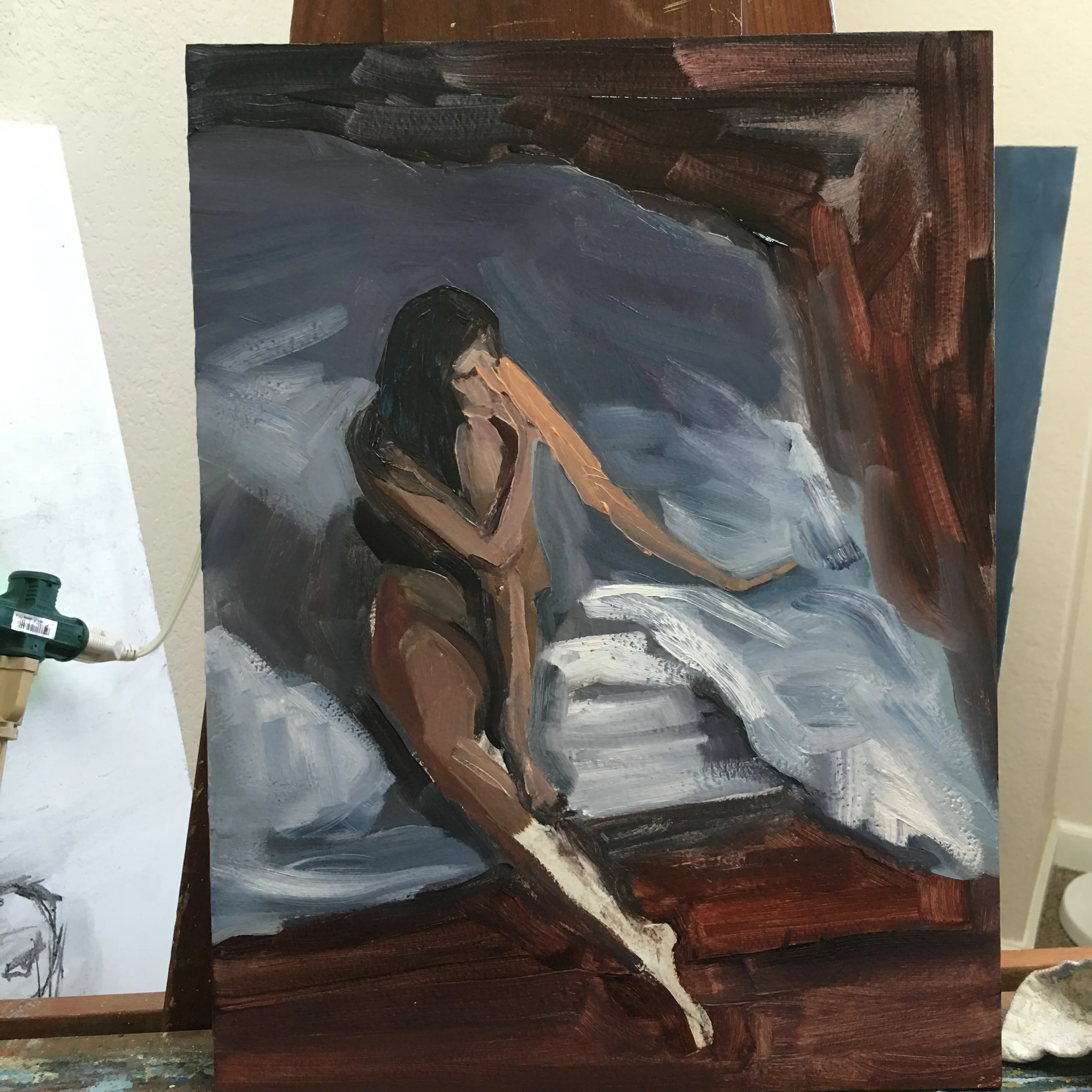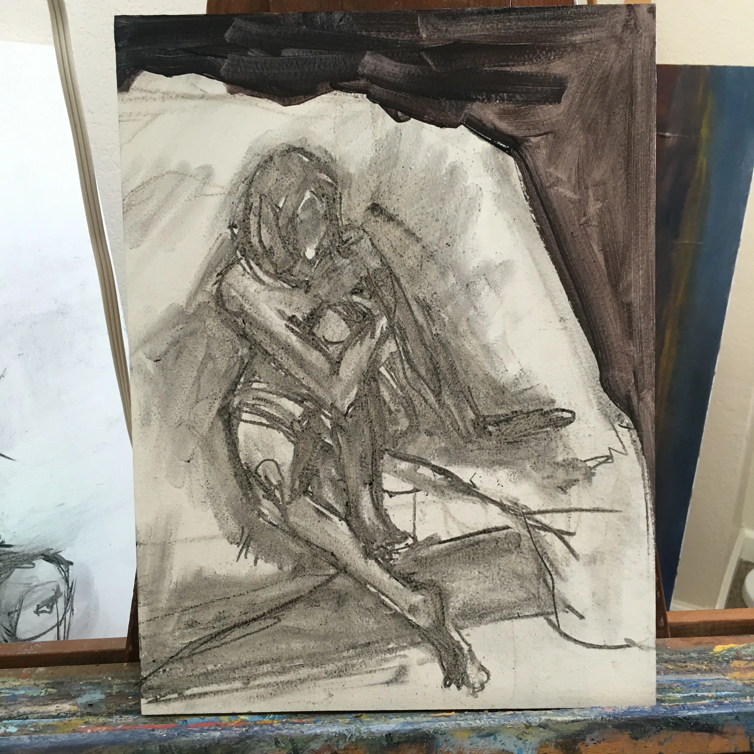 She sat, drawn, on my easel for at least a week. But I was too intimidated to start. Is that right: intimidated? Yes, in part. But tired, distracted, worried, self-absorbed, in the mode of I'm-only-fooling-myself-'cause-I'm-no-painter. Yes, lacking confidence. But, there I was walking into the room, having announced I was going to paint for two hours on Saturday morning. So, I painted. Better than being a liar in front of my kids.