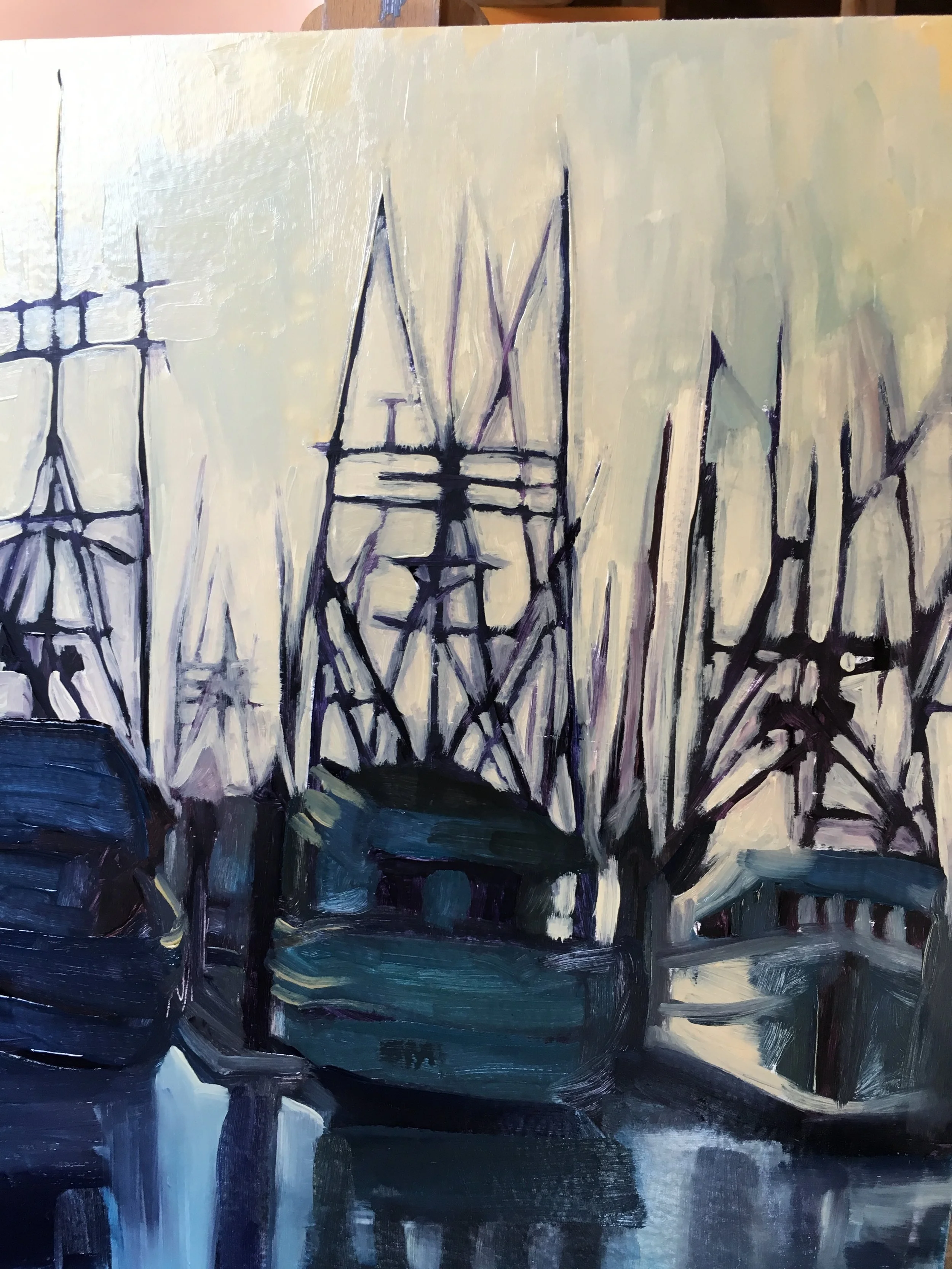 "Three Boats From Here in progress". The masts, like all my opening lines, start so boldly. "Not a Single Speck of Land in Sight" January 09, 2017