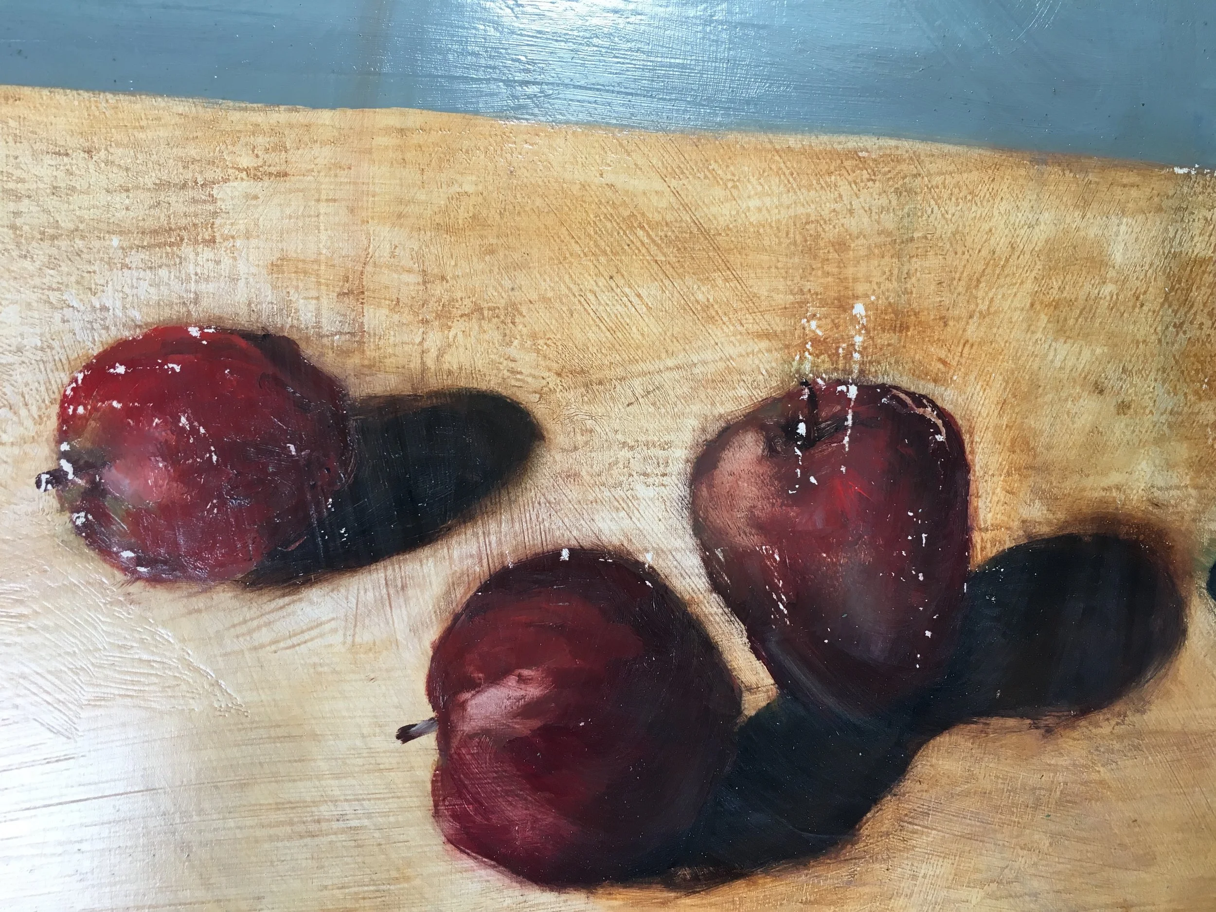Returning to a childhood home, I find my old work, finished and abandoned in progress. While there are many lessons in such a survey, I recently decided to repurpose many of my old panels. The <windfall> of such work for me is in having once pursued their making and now having considered them again. To work again atop, seems like the higher purpose for me and the wood and the paint. So... these apples from nearly 20 years ago have been officially sauced!